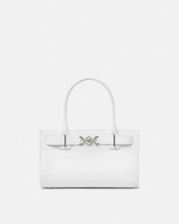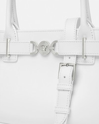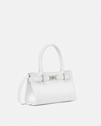 DETAILS This medium-sized horizontal tote bag is crafted from smooth, flat-grain leather and features the Medusa '95 hardware – the iconic House code first seen in the 1995 collections. The top handle design has a magnetic closure and two internal slip pockets. - Medusa '95 hardware - Versace logo embossing - Top handles - Magnetic closure - Two internal slip pockets - Metal feet - Outer composition: 100% Calf leather - Lining: 100% Lambskin Item: 1013168-1A10795_DTU_UNICA_1W00P__ SIZE & FIT - L12.2" x W4.1" x H7.5" - Drop: L6.5" - Approximate weight: 17.6 oz