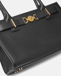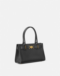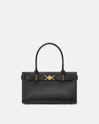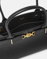 DETAILS This medium-sized horizontal tote bag is crafted from smooth, flat-grain leather and features the Medusa '95 hardware – the iconic House code first seen in the 1995 collections. The top handle design has a magnetic closure and two internal slip pockets. - Medusa '95 hardware - Versace logo embossing - Top handles - Magnetic closure - Two internal slip pockets - Metal feet - Outer composition: 100% Calf leather - Lining: 100% Lambskin Item: 1013168-1A10795_DTU_UNICA_1B00V__ SIZE & FIT - L12.2" x W4.1" x H7.5" - Drop: L6.5" - Approximate weight: 17.6 oz