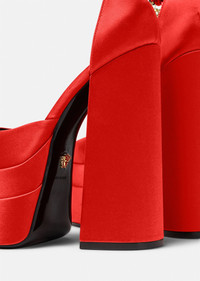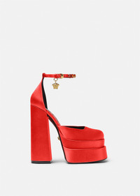 A statement runway design, these satin pumps feature a high block heel and a double platform. The ankle strap is adorned with rhinestones and a signature Medusa charm. DETAILS & CARE - Ankle belt - Crystals - Medusa charm - Square toe - High heel - Double platform - Upper: 72% Viscose 28% Silk - Insole: 100% Goat leather - Sole: 100% Calf leather - Made in Italy SIZE & FIT - Height: 15,5 - Platform: 3 + 3 - All sizes fit Italian standards - Fits true to size, take your normal size