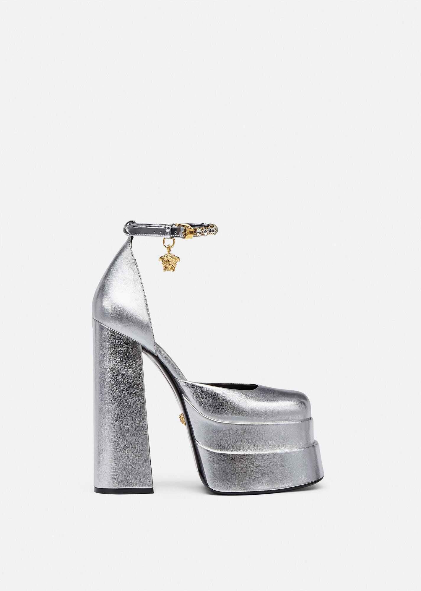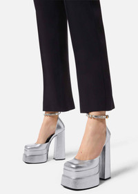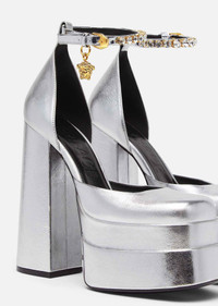 A statement runway design, these satin pumps feature a high block heel and a double platform. The ankle strap is adorned with rhinestones and a signature Medusa charm. DETAILS & CARE - Ankle strap - Crystal embellishments - Medusa charm - Square toe - High heel - Double platform - Outer fabric: 100% Lambskin - Lining: 100% Goat Leather - Sole: 100% Calf Leather SIZE & FIT - Heel Height: 15 cm - Fits true to size, take your normal size - All sizes fit Italian standards