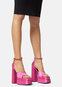 A Very Versace design, these satin sandals feature a squared, open toe with a high block heel and a double platform. The ankle strap is adorned with crystals and a signature Medusa charm. DETAILS & CARE - Ankle belt - Crystals - Medusa charm - Square open toe - High heel - Double platform - Outer composition: 72% Viscose, 28% Silk - Lining 1: 100% Goat leather - Sole: 100% Calf leather - Trim: 100% Lambskin SIZE & FIT - All sizes fit Italian standards - Fits true to size, take your normal size