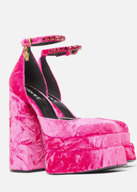 A statement Versace design, these textured velvet pumps feature a high block heel and a double platform. The ankle strap is adorned with a signature Medusa charm. DETAILS & CARE - Medusa charm - Buckle ankle strap - Square toe - Block and platform heel - Outer composition: 62% Polyester, 32% Cotton, 6% Elastane - Lining 1: 100% Lambskin - Lining 2: 100% Goat leather - Sole: 100% Calf leather - Trim: 100% Lambskin SIZE & FIT - All sizes fit Italian standards - Fits true to size, take your normal size - Heel 15,5 cm