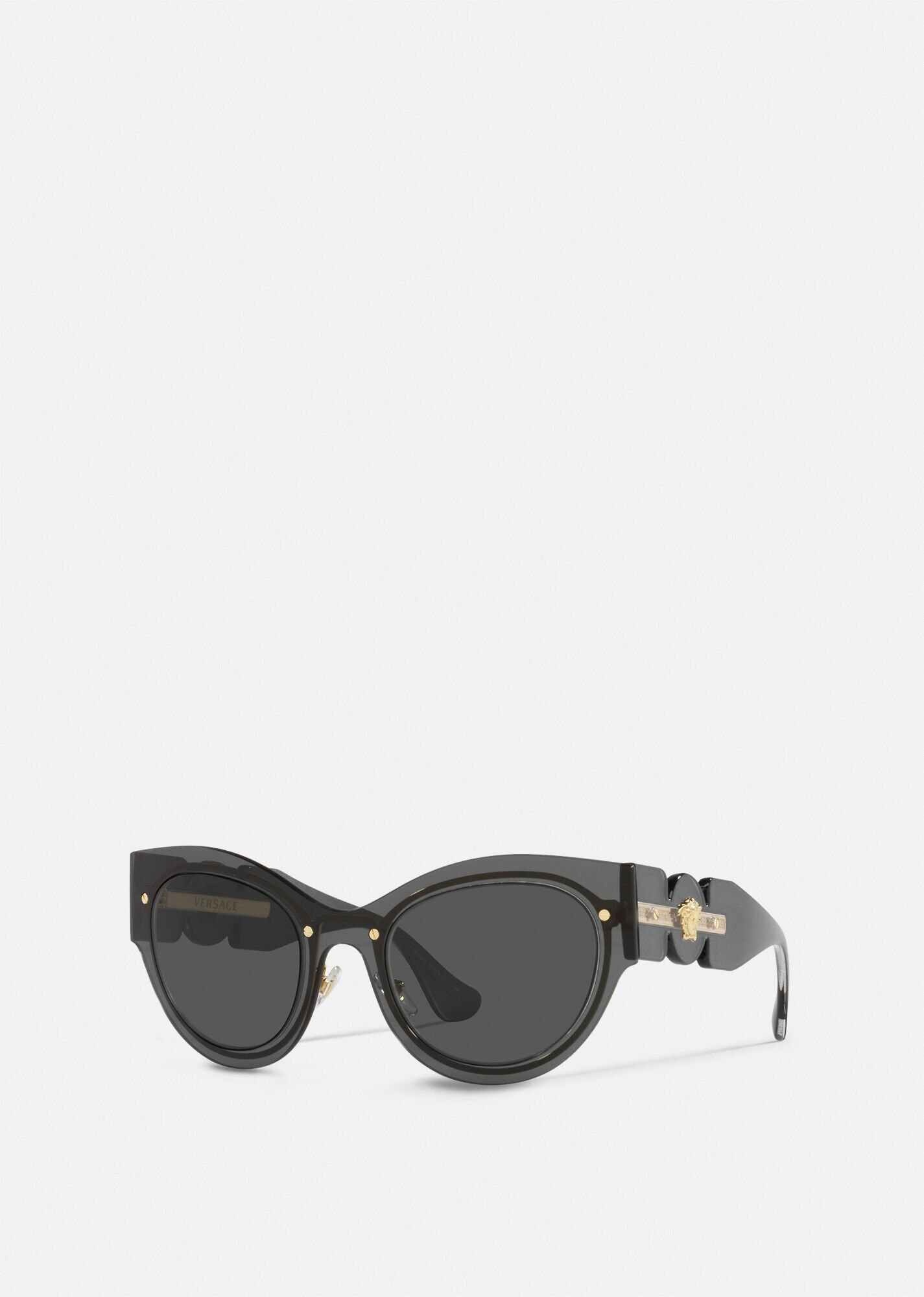 Inspired by the opulent style of the iconic hip-hop legend, these bold butterfly shaped lens and wide temples are embellished by a gold-tone Medusa plaque with Greca hardware. In a classic combination of a thick black frame and dark grey lenses. DETAILS & CARE - Butterfly shaped lens - Frame colour: Transparent dark grey - Temple colour: Transparent dark grey - Details: Gold-tone heritage Medusa Medallion - Lens colour: Dark grey - Frame: Metal - Temple: Injected - Made in Italy SIZE & FIT - Eye size: 53 - Bridge: 23 - Temple: 140