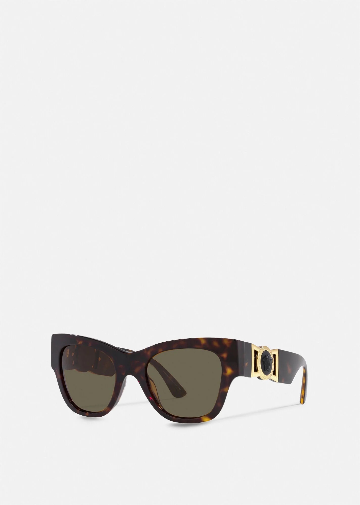 Inspired by '90s hip-hop culture, these butterfly-shaped square sunglasses have tortoiseshell acetate frames and wide, Medusa-embellished temples. DETAILS & CARE - Cat-eye shaped lens - Frame colour: Havana - Temple colour: Havana - Details: Butterfly style metal detail on temples - Lens colour: Brown - Frame: Acetate - Temple: Nylon - Can be adapted to prescription lenses - Made in Italy SIZE & FIT - Eye size: 51 - Bridge: 21 - Temple: 145