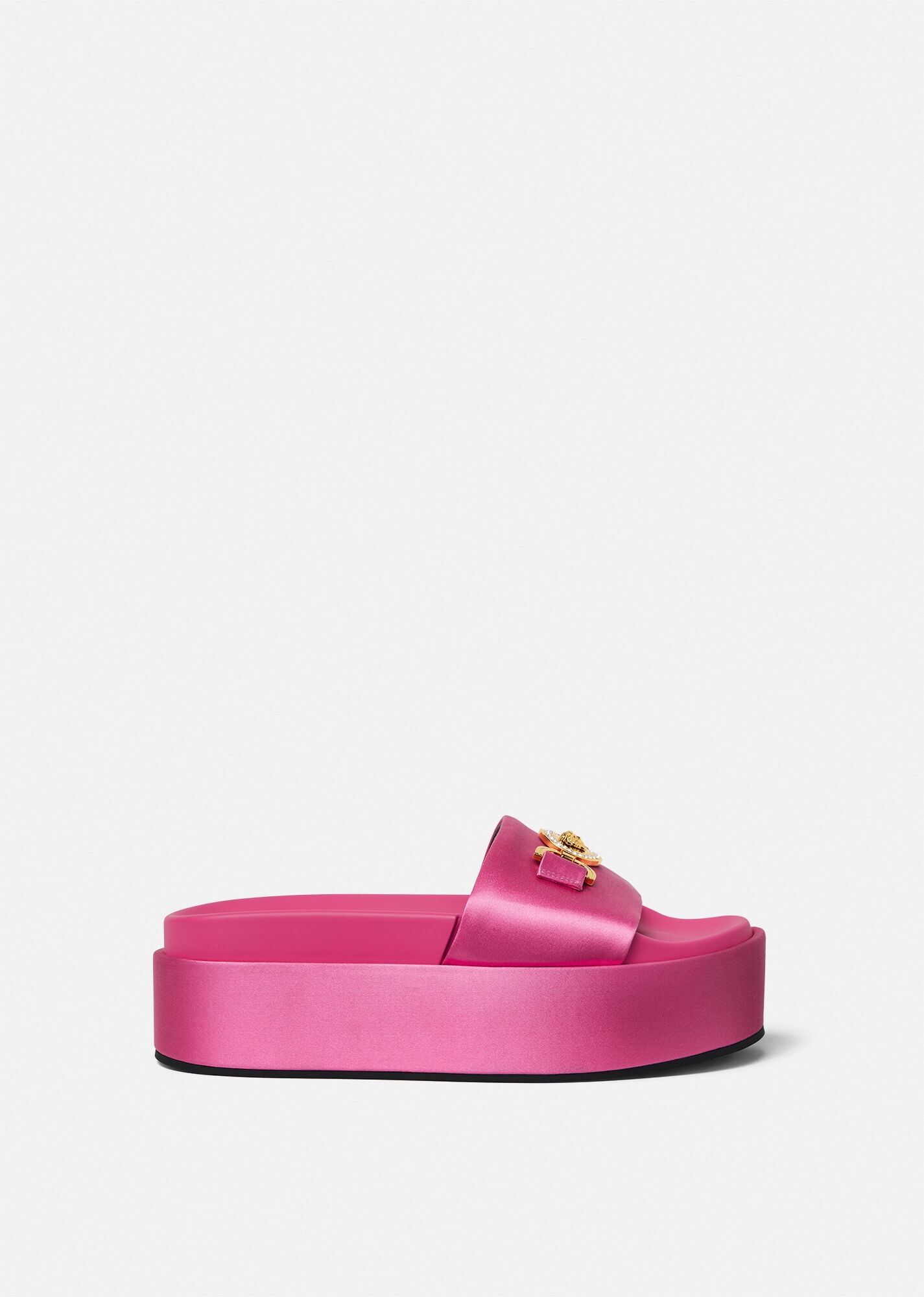 These satin sandals are enriched with a crystal-embellished Medusa Biggie emblem and are set on a platform sole. DETAILS & CARE - Medusa Biggie hardware - Crystal embellishments - Round toe - Platform - Outer composition: 100% Viscose - Lining: 100% Lambskin - Sole: 100% Rubber SIZE & FIT - Platform: 2'4" in - Fits true to size, take your normal size