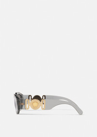 Sunglasses that evoke the opulent style of a hip-hop icon with a bold low-lens shape and wide temples embellished by a gold-tone heritage Medusa medallion. In a contemporary combination of a thick grey frame and silver mirrored lenses. SIZE & FIT - Width: 53 - Bridge: 18 - Temple: 140 - Lens: 53