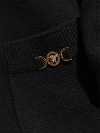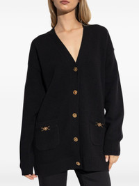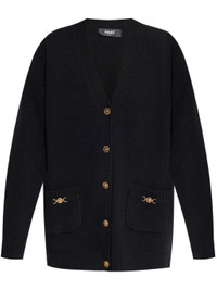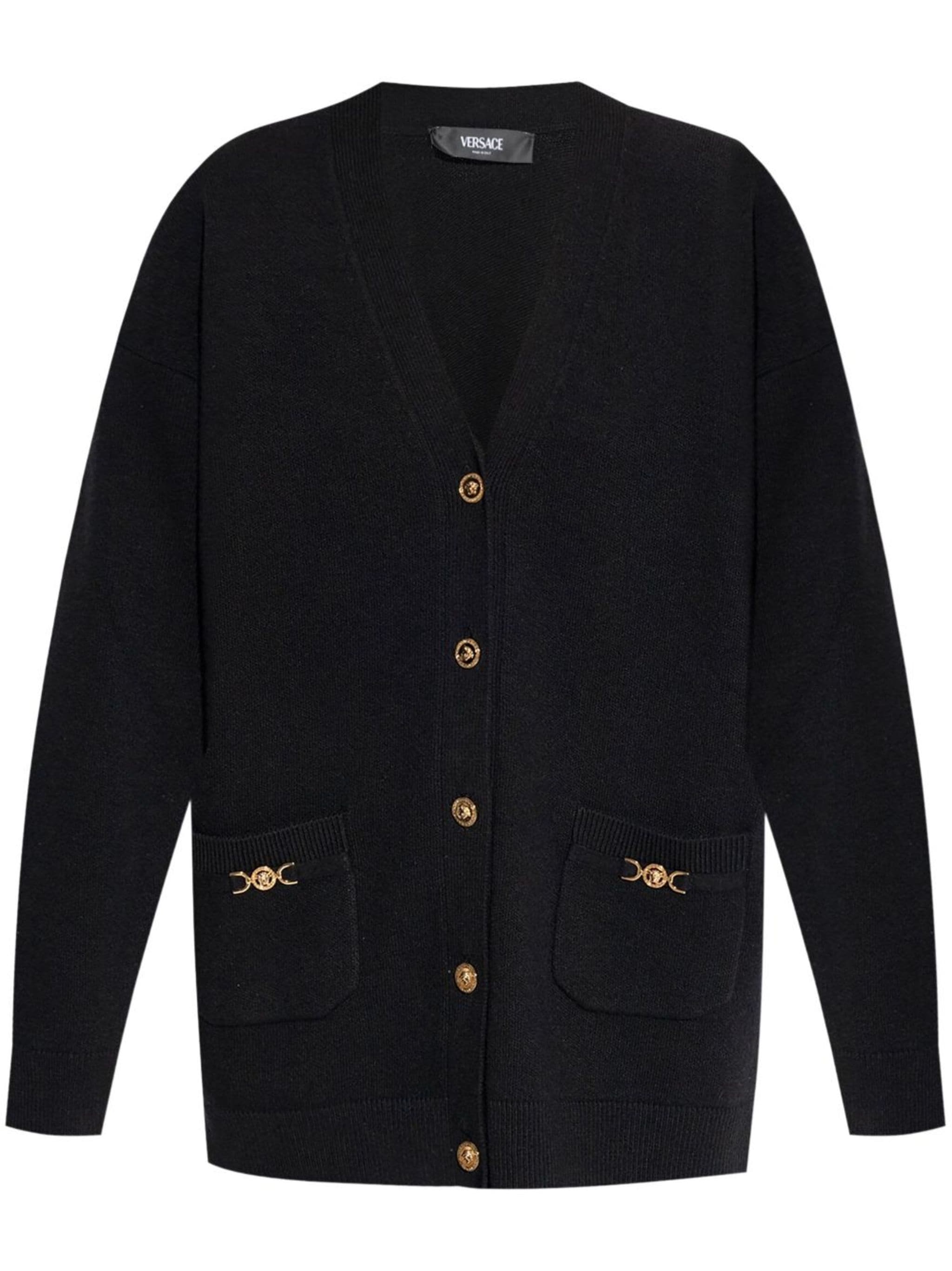 black virgin wool knitted construction signature Medusa Head buttons ribbed trim V-neck drop shoulder front button fastening long sleeves two front patch pockets straight hem Size & Fit Model Measurements: Bust: 0cm Height: 0cm Hips: 0cm Waist: 0cm Fabric and Care Designer Style ID: 10140911A11287 Designer Colour: 1B000 BLACK Composition: Virgin wool 100% Washing instructions: Read Manufacturer Guidelines Made in Italy