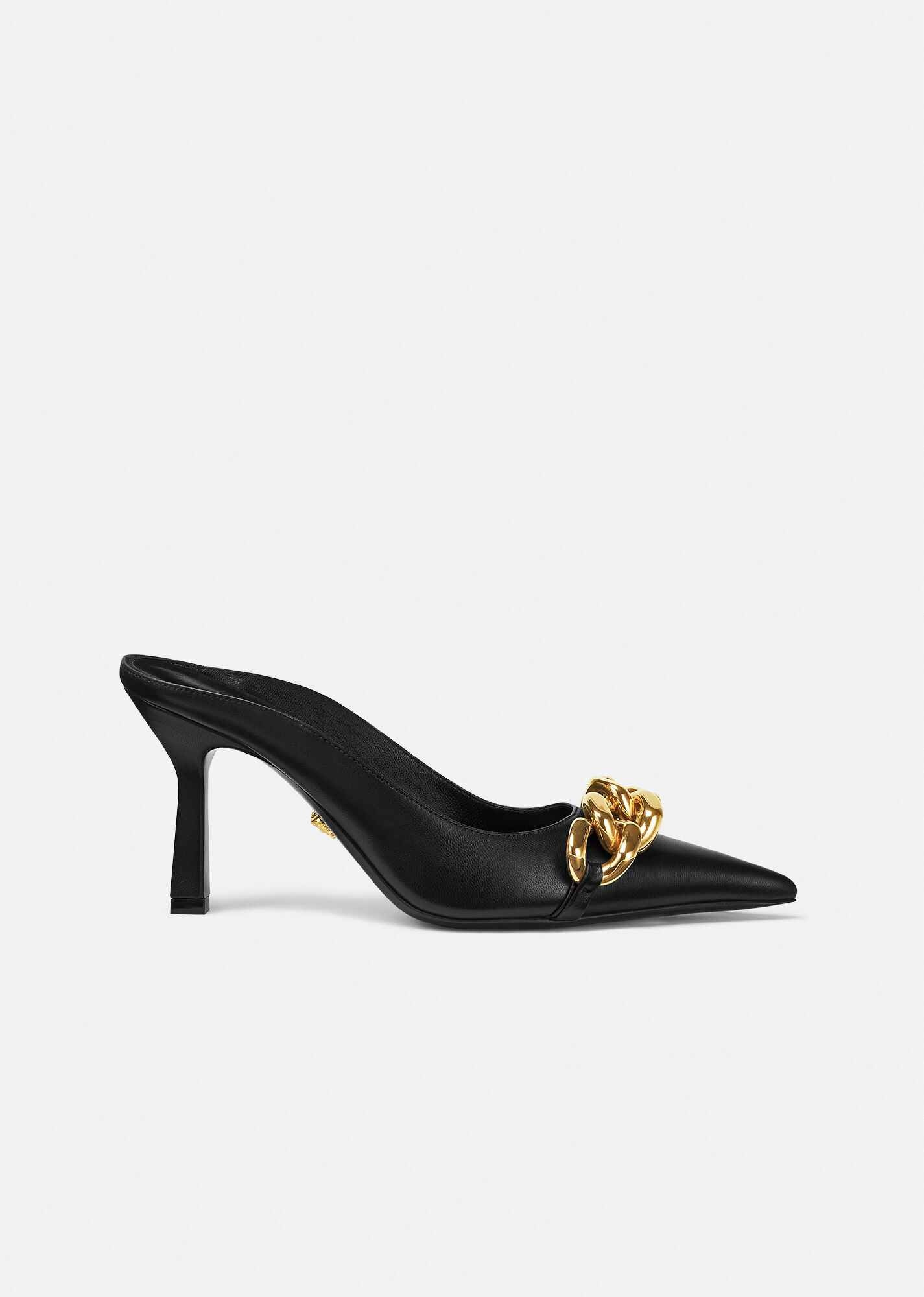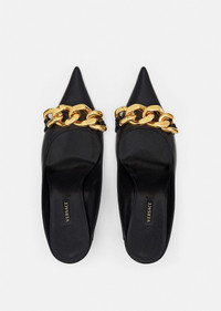 A style that easily transitions from the office to happy hour, these pointed toe mules feature a high, yet manageable heel. The soft nappa leather design is adorned with a bold, golden chain on the toes. DETAILS & CARE - Golden chain - Pointed toe - High heel - Upper: 100% Nappa leather - Insole: 100% Goat leather - Sole: 100% Calf leather - Made in Italy SIZE & FIT - Height: 8,5cm - All sizes fit Italian standards - Fits true to size, take your normal size