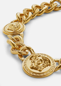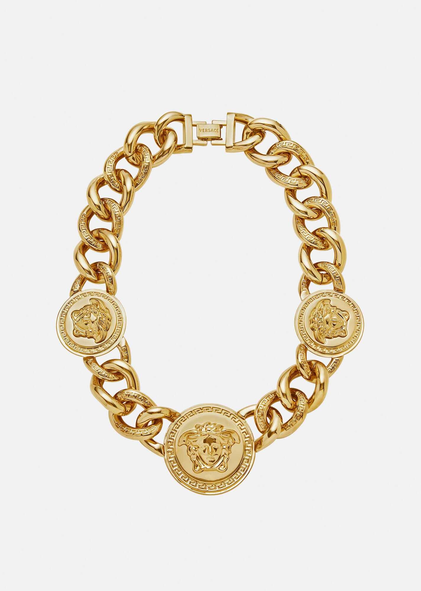 An iconic Versace design, this chunky chain-link necklace is embellished with heritage Medusa medallions. All Versace Jewelry items are lead and nickel free. All materials are hypoallergenic. DETAILS & CARE - Chain necklace - Medusa medallions - Hook fastening - Metal: Brass - Finish: Versace Gold - Please note water and perfume may damage the item - Made in Italy SIZE & FIT - Length: 45 cm