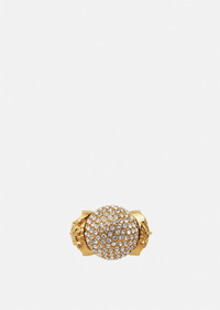 This ring features a crystal-embellished sphere supported by three-dimensional Medusa settings on either side. An engraved Versace logo and size appear on the inside. All Versace jewelry items are lead and nickel free. All materials are hypoallergenic. DETAILS & CARE - Medusa hardware - Crystal-embellishments - Outer composition: 100% Metal
