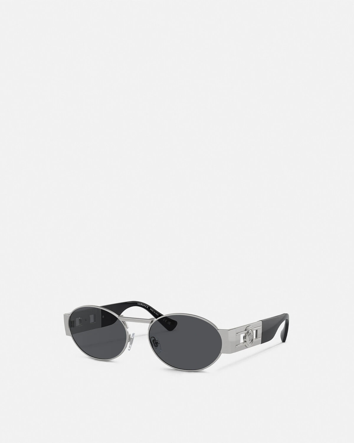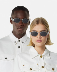 DETAILS Oval frame sunglasses defined by geometric lines at the nose bridge and temples, accented by a Medusa hardware at the side. - Medusa hardware - Frame color: Silver-tone - Temple color: Silver-tone - Lens color: Dark grey - Frame: Metal - Temple: Metal Item: O2264-O15138756_RTU_TU_ONUL__ SIZE & FIT - Eye size: 2.2"