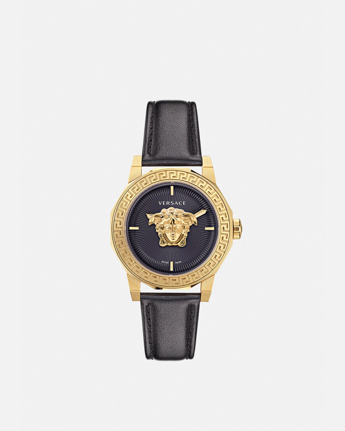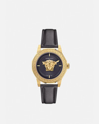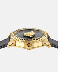 DETAILS A Versace design with a three-dimensional floating Medusa on a guilloche dial. The top ring is detailed with a Greca pattern, and the timepiece is complete with a leather bracelet. All Versace watches are guaranteed by the 'Swiss Made' marking. - Case: IP2N case Greca top ring / 3D Medusa set between two crystals - Dial: Black guilloche dial / Versace logo at 12h - Bracelet: Black genuine calf leather strap with butterfly buckle - Movement: RONDA 762.3 Swiss Quartz 2-hands movement - Water Resistant: 5 ATM Item: PVE7B002-P0023_RTU_TU_PNUL__ SIZE & FIT - Case: 1.5"