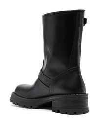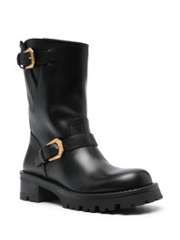 Medusa-embossed leather boots Versace's iconic Medusa motif appears throughout the house's collections. Here, the emblem is incorporated as an embossed detail on the sides of these chunky boots which are finished with gold-tone buckle fastening. Highlights - Black - Calf leather - Calf-length - Buckle fastening - Gold-tone hardware - Medusa head motif - Round toe - Chunky rubber lug sole Made in Italy Composition Leather 100% SIZE & FIT Measurement CIRCUMFERENCE 13.77 in(35 cm) HEEL 1.77 in(4.5 cm) HEIGHT 8.07 in(20.5 cm) Sole height 0.98 in(2.5 cm)