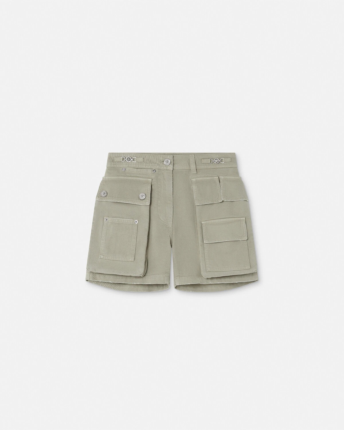 DETAILS Denim shorts with spacious cargo pockets and accent Medusa 95 hardware at the waist - Medusa '95 hardware - Versace logo leather patch - Belt loops - Side pockets - Cargo pockets - Back patch pockets - Outer composition: 100% Cotton - Trim: 100% Calf leather Item: 1015651-1A10427_1D770