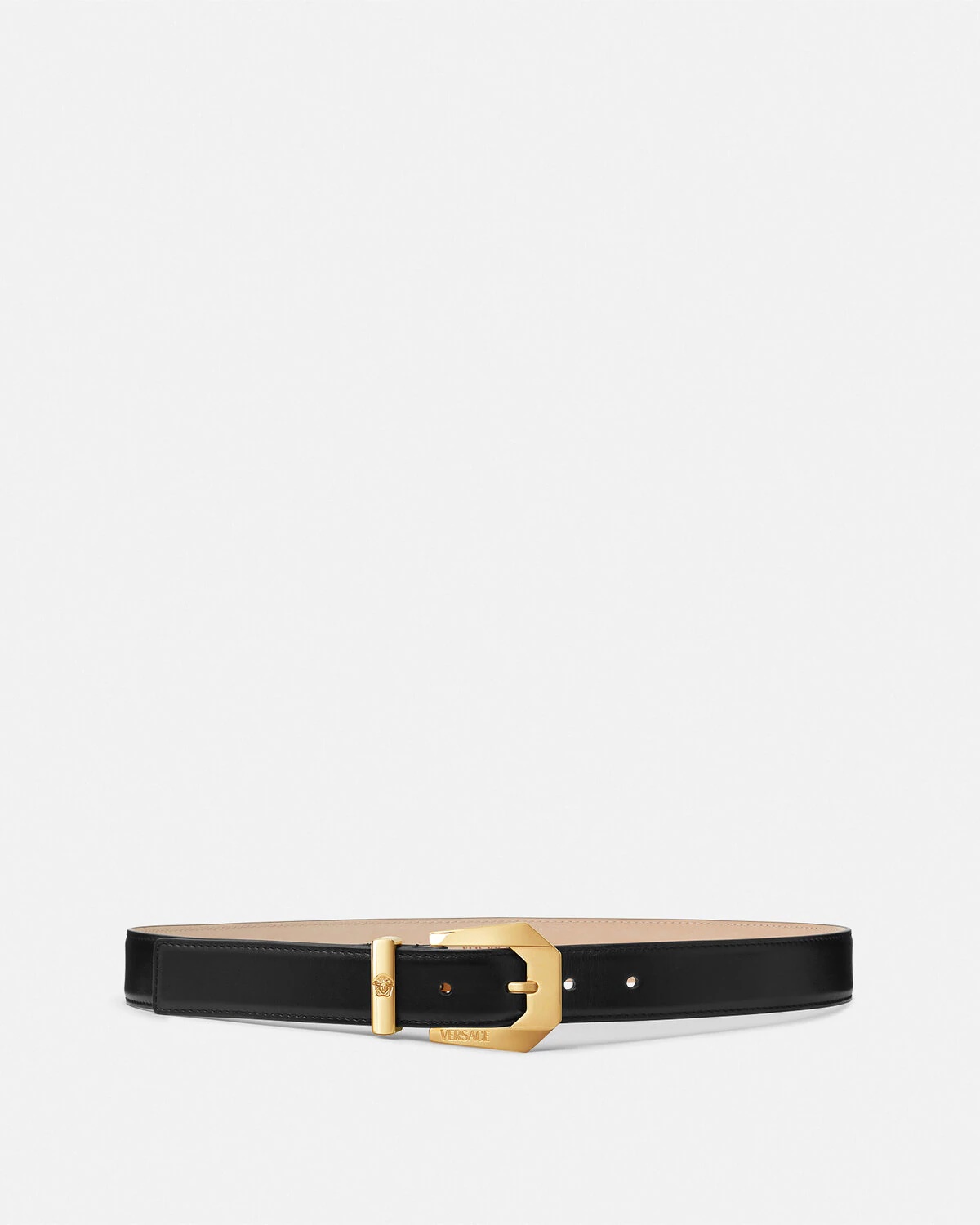DETAILS Smooth leather belt featuring the Medusa Heritage buckle with accent belt loops. - Medusa Heritage buckle - Accent belt loops - Outer composition: 100% Calf leather - Lining: 100% Calf leather Item: 1007419-DV3T_1B00V SIZE & FIT - Height: 1.2" - Adjustable
