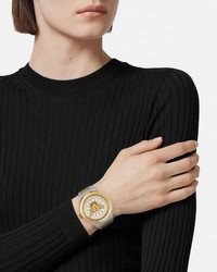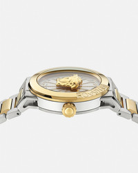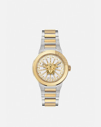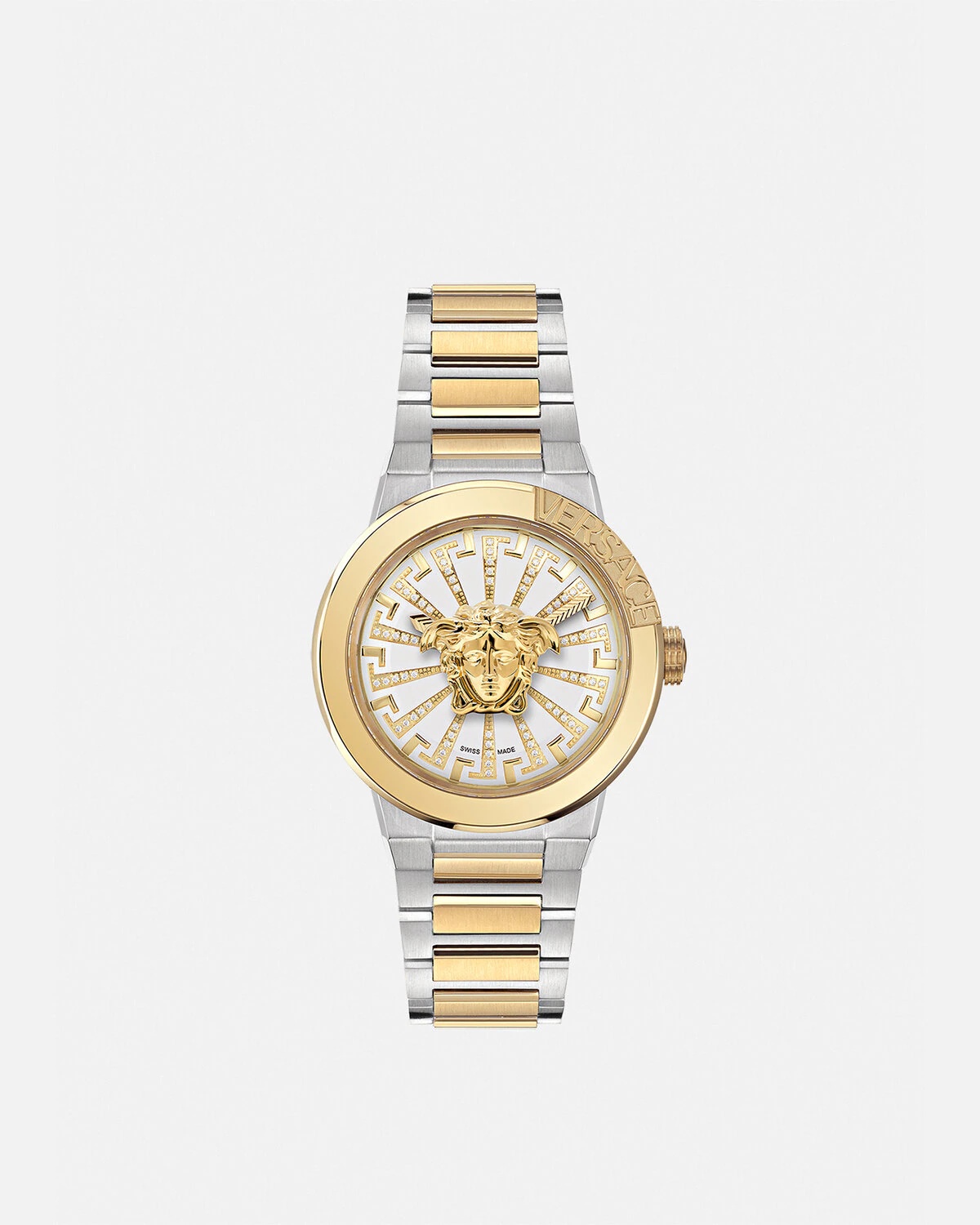 DETAILS Part of the "We Love Diamonds" capsule, the Medusa Infinite watch features a floating Medusa on the dial, enriched with 70 diamonds (0,17 carats) on metallic Greca-shaped indexes. All Versace watches are guaranteed by the 'Swiss Made' marking. - Case: Bico (SS & IP2N) with Versace logo on the top ring / Medusa set between two crystals - Dial: White-silver and Green overlaid dial / Greca on the inner ring / IP2N lower dial / 70 diamonds on dial (0,17 kt) - Bracelet: Bico (SS&IP2N) with butterfly buckle - Movement: RONDA 762.3 Swiss Quartz 2-hands movement - Water Resistant: 5 ATM Item: PVE3F008-P0023_RTU_TU_PNUL__ SIZE & FIT - Case: 1.5"