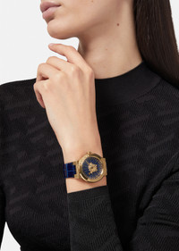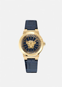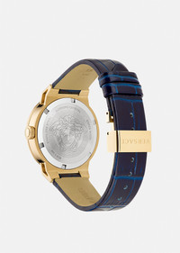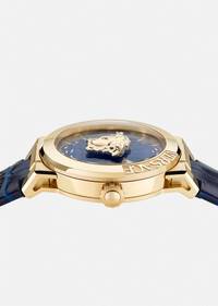 This elegant timepiece features a three-dimensional Medusa set between two crystals with a two-hands movement system. A lug Greca pattern features on the inner dial, while an engraved Versace lettering at the ring frames the case. The accessory is finished with a croc-effect leather band. DETAILS & CARE - Case: 38 mm IP Champagne round case with Versace logo on the ring - Dial: Blue dial with Medusa between two crystals; Greca on the inner ring; IP Champagne lower dial - Bracelet: Blue croc-effect genuine calf leather strap with butterfly buckle - Movement: RONDA 762 Swiss Quartz 2-hands movement - Water Resistant: 5 ATM SIZE & FIT - Case: 38 mm