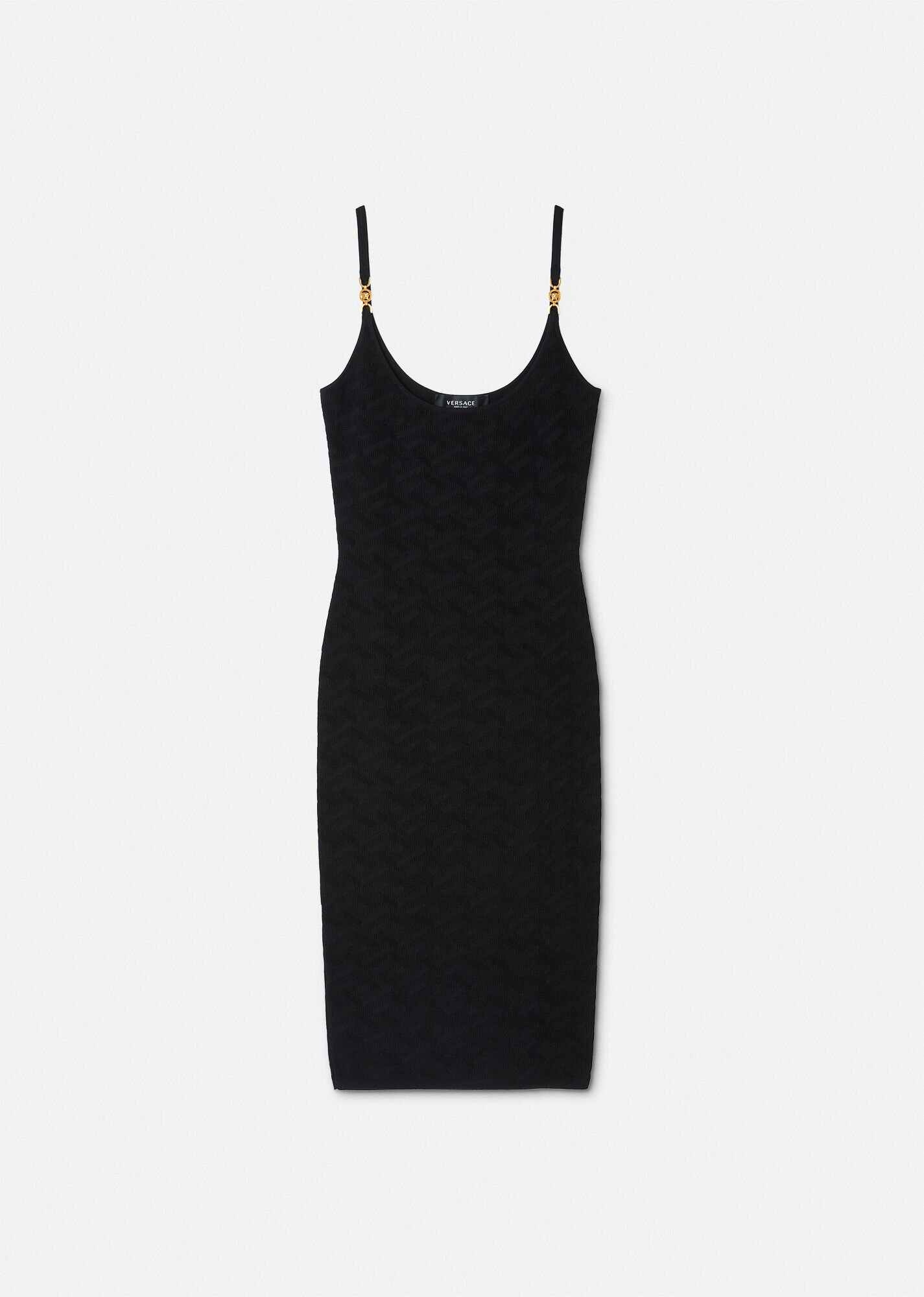 In a tonal jacquard La Greca pattern, this ribbed bodycon midi dress features Medusa hardware accents on the shoulder straps. DETAILS & CARE - Medusa hardware - Tonal La Greca pattern - Rib knit - Thin shoulder strap - Scoop neckline - Made from responsibly sourced natural materials - Outer Fabric: 95% Viscose 4% Nylon 1% Elastane - Do not wash - Do not bleach - Do not tumble dry - Cool iron - Delicate dry clean SIZE & FIT - All sizes fit Italian standards
