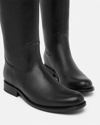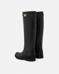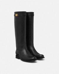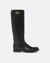 DETAILS These flat equestrian kneehigh boots are crafted from leather in a smooth finish with a Goodyear construction for added strength and durability The pair features a Medusa 95 belt detail - Medusa '95 hardware - Round toe - Slip on - Stacked heel - Outer composition: 100% Calf leather - Lining 1: 100% Lambskin - Lining 2: 100% Goat leather - Sole: 100% Calf leather Item: 1015912-1A04174_1B00V SIZE & FIT - The shoe weighs approximately 24.7 oz / 0.7 kg for the model size 40 IT - Heel: 1" / 2.5 cm - Leg: H16.3" / O13.8" / H41.5 / O 35 cm - Footbed: regular - Fits true to size, take your normal size