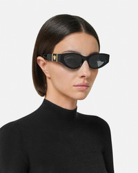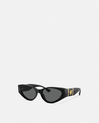 DETAILS Elegant cat-eye sunglasses with acetate frames, accented by a Medusa emblem at the temples. - Medusa hardware - Frame color: Black - Temple color: Black - Lens color: Dark Gray - Frame: Acetate - Temple: Acetate Item: O4454-OGB18755_RTU_TU_ONUL__ SIZE & FIT - Eye size: 2.2"