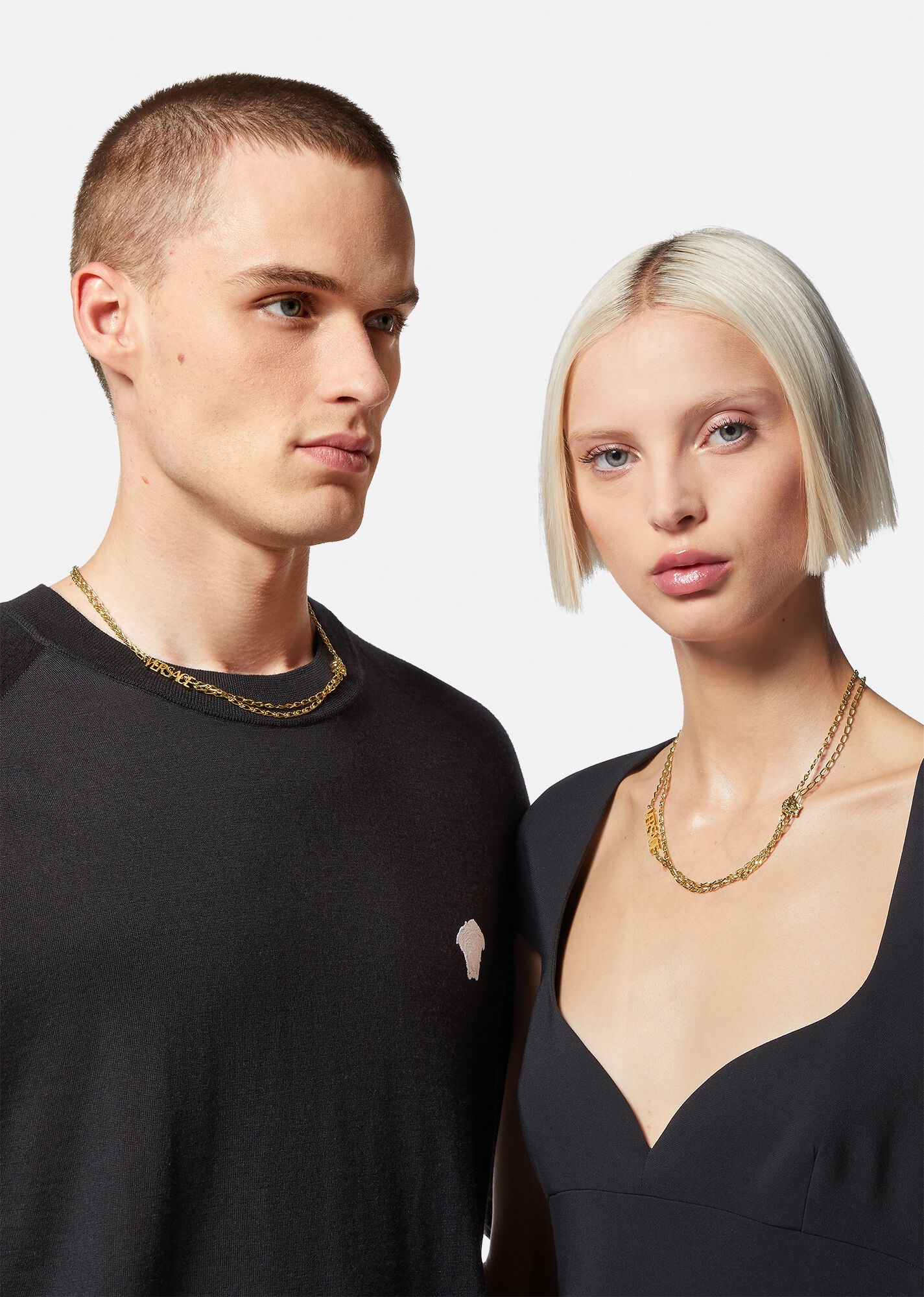 This interlocking, double-chain necklace, features Versace lettering and signature Medusa charms. All Versace jewelry products are lead and nickel free. All materials are hypoallergenic. DETAILS & CARE - Logo - Medusa charms - Lobster clasp closure - Metal: Brass - Finish: Versace Gold - Please note water and perfume may damage the item - Made in Italy SIZE & FIT - Length: 4,5 cm