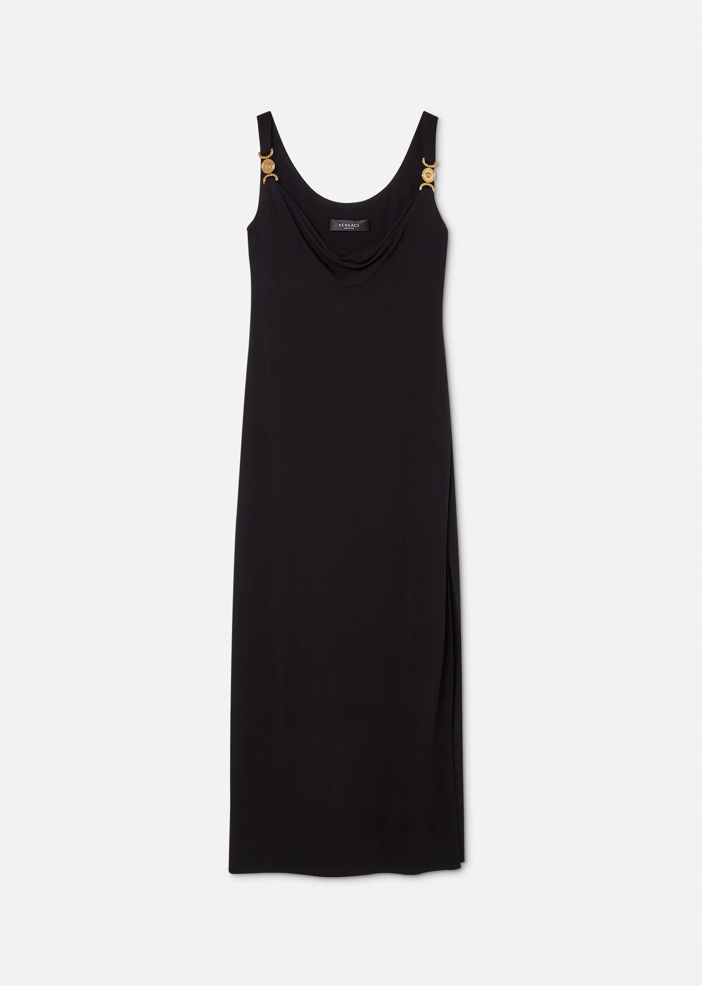 DETAILS Versace presents Dua Lipa x Versace—a capsule collection co-designed with Dua Lipa. Crafted in a slim-fitting silhouette, this crêpe gown has a sleeveless design with Medusa '95 hardware accents at the shoulder straps. The evening style is detailed with a draped, scoop neckline. - Medusa '95 hardware - Sleeveless - Scoop neckline - Outer composition: 95% Viscose 5% Elastane - Fabric made from FSC-certified responsibly sourced viscose Item: 1009193-1A01253_1B000 SIZE & FIT - The model is 5'10" tall and wears size 38 IT