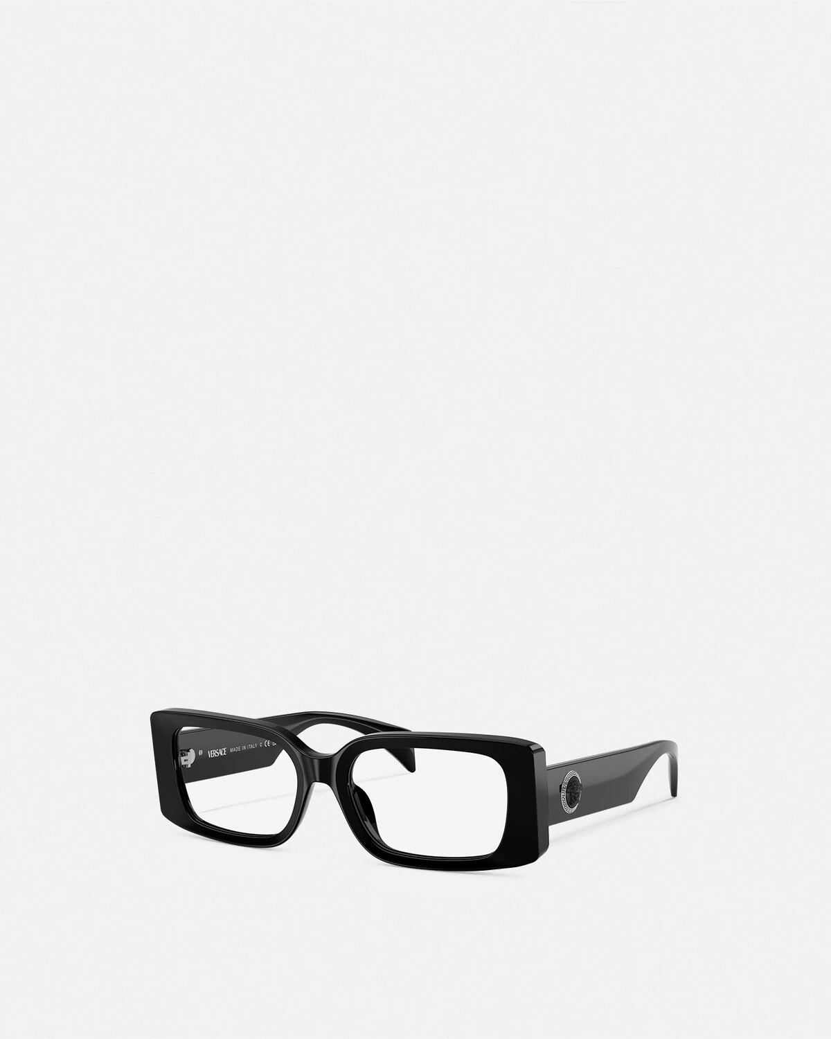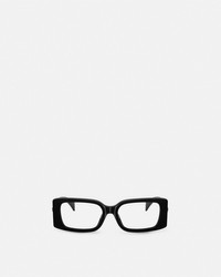 DETAILS These square-frame optical glasses feature acetate frames with a tonal Medusa emblem at the temples with a metal Greca frame. - Medusa motif - Greca border - Frame color: Black - Temple color: Black - Lens color: Transparent - Frame: Acetate - Temple: Acetate Item: O3362U-OGB151_RTU_TU_ONUL__ SIZE & FIT - Eye size: 2"