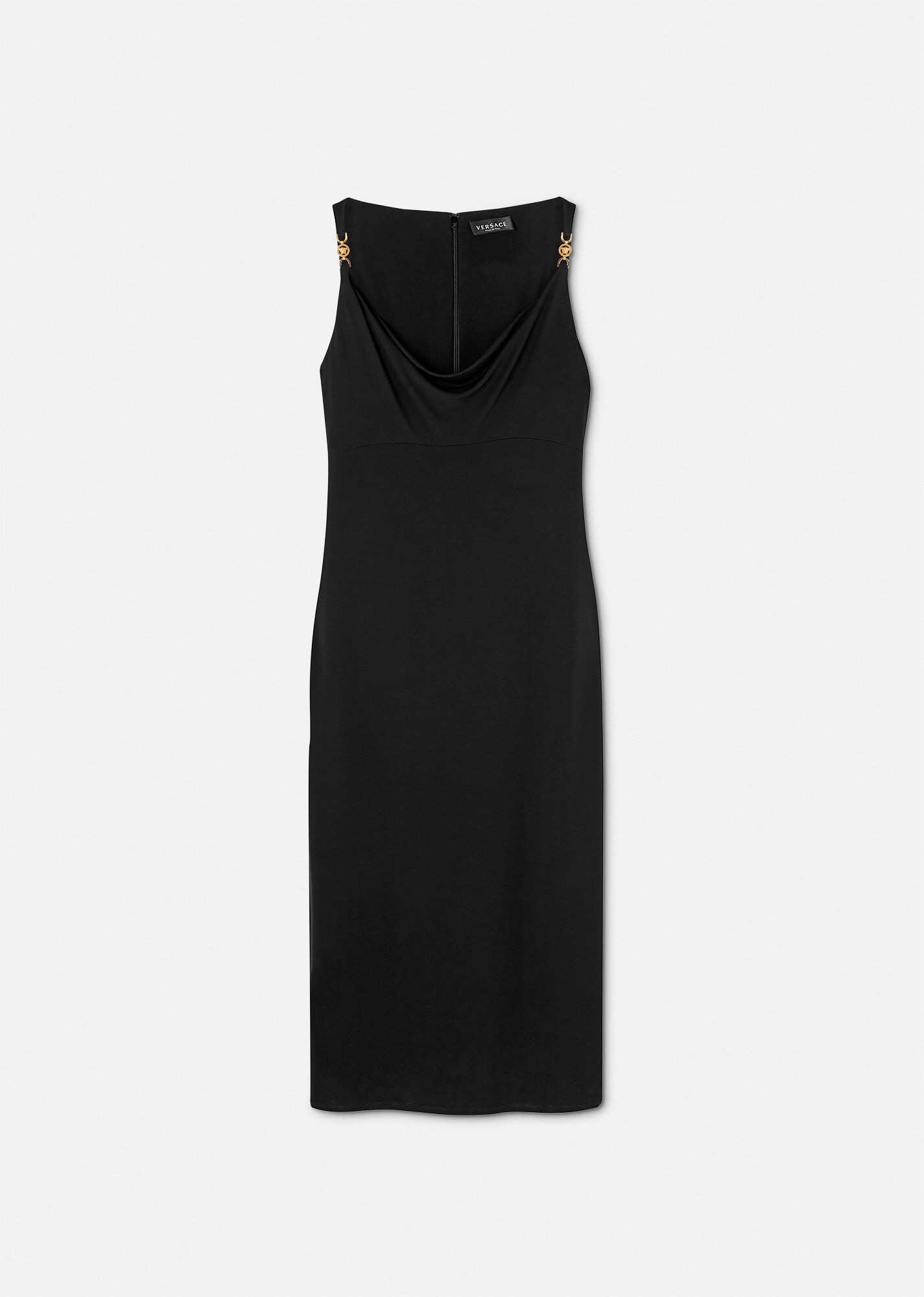 DETAILS Crafted in a slim-fitting silhouette, this crêpe mini dress has a sleeveless design with Medusa hardware on the shoulder straps with a draped scoop neckline. - Medusa '95 hardware - Sleeveless - Scoop neckline - Concealed back zip closure - Outer composition: 95% Viscose 5% Elastane - Fabric made from FSC-certified responsibly sourced viscose Item: 1008745-1A01253_1B000 SIZE & FIT - The model is 5'10" tall and wears size 38 IT