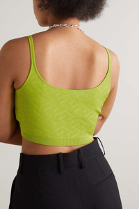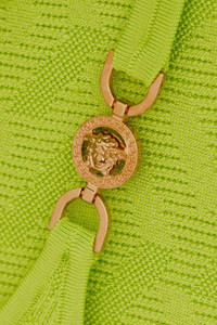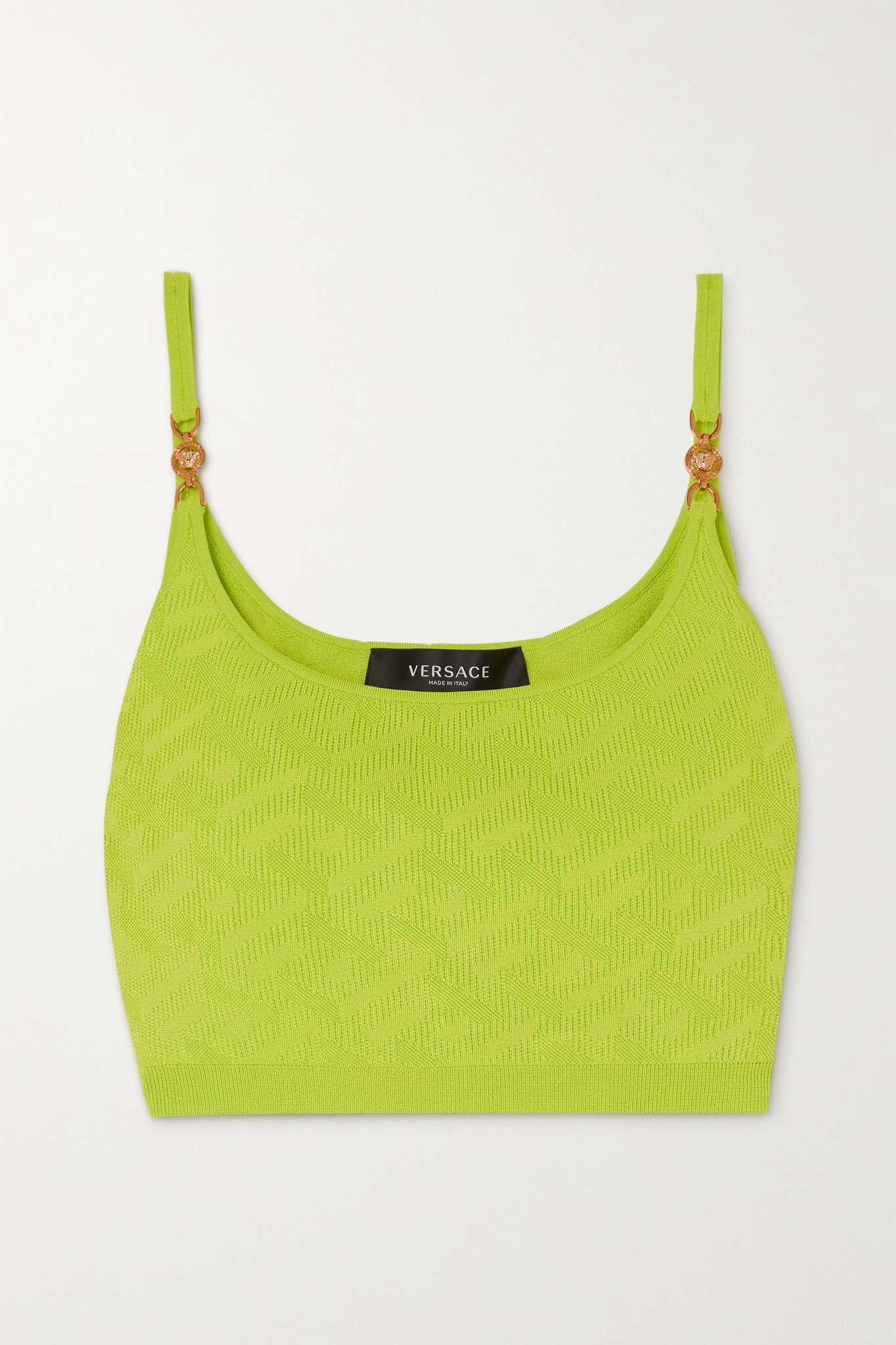 EDITORS'NOTES Versace incorporates one of its most iconic motifs into this top. Embellished with 'Medusa' hardware at the straps, it's knitted for a close fit and hits to an ultra cropped length. Wear yours with leather. SIZE & FIT - Fits large to size, take one size smaller than normal - Designed for a close fit - Fine knit - Model is 177cm/ 5'10" and is wearing an IT 42 DETAILS & CARE - Neon-green viscose, polyamide and elastane-blend - Slips on - 92% viscose, 6% polyamide, 2% elastane - Dry clean - Designer color: Acid Lime Large to size. See Size & Fit notes.