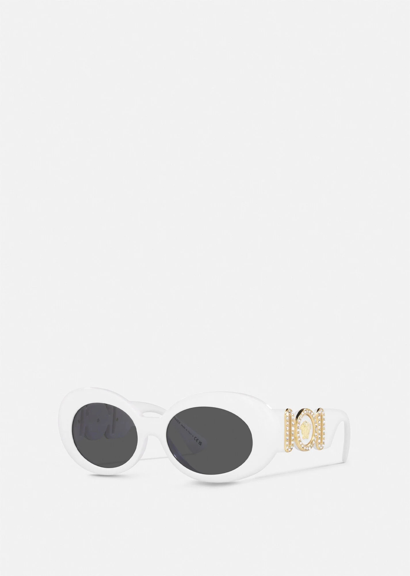 DETAILS Inspired by '90s hip-hop culture, these sunglasses feature acetate frames and wide Medusa-embellished temples. The oval shape is finished with dark lenses. - Frame colour: White - Temple colour: White - Details: Gold-tone Medusa Biggie hardware - Lens colour: Dark Grey - Lens shape: Oval - Frame: Acetate - Temple: Injected - Made in Italy Item: O4426BU-O3148754_RTU_TU_ONUL__ SIZE & FIT - Eye size: 54 - Bridge: 19 - Temple: 145