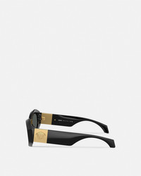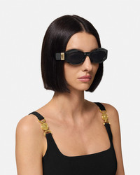 DETAILS Featuring an oval shape with structured, irregular lines, these sunglasses with injected frames are accented by a Medusa hardware at the sides. - Medusa hardware - Frame color: Black - Temple color: Black - Lens color: Dark gray - Frame: Injected - Temple: Injected Item: O4466U-OGB18754_RTU_TU_ONUL__ SIZE & FIT - Eye size: 2.1" - Bridge: 0.7" - Temple: 5.5"