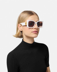 DETAILS These wide, squared sunglasses are defined by geometric lines and feature a Medusa accent at the temples. - Medusa hardware - Frame color: White - Temple color: White - Lens color: Gradient dark brown - Frame: Nylon - Temple: Metal Item: O4467U-O54621354_RTU_TU_ONUL__ SIZE & FIT - Eye size: 2.1" - Bridge: 0.7" - Temple: 5.5"