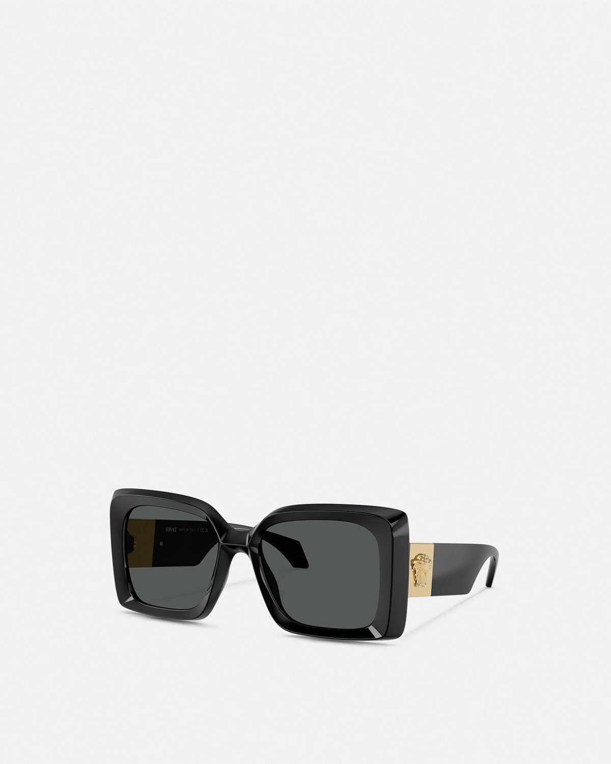 DETAILS These wide, squared sunglasses are defined by geometric lines and feature a Medusa accent at the temples. - Medusa hardware - Frame colour: Black - Temple colour: Black - Lens colour: Dark grey - Frame: Nylon - Temple: Injected Item: O4467U-OGB18754_RTU_TU_ONUL__ SIZE & FIT - Eye size: 2.1" - Bridge: 0.7" - Temple: 5.5"