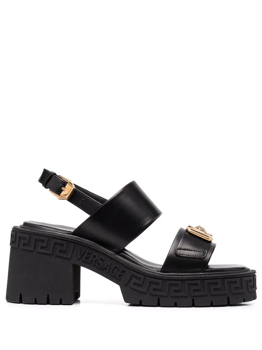Medusa-plaque sandals black/gold tone leather Medusa plaque detail gold-tone hardware signature embossed Greca detailing single toe strap open toe buckle-fastening slingback strap mid block heel Made in Italy Composition Outer: Calf Leather 100% Lining: Calf Leather 100% Sole: Rubber 100% SIZE & FIT Measurement HEEL 3.54 in(9 cm) PLATFORM 1.57 in(4 cm)