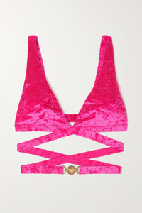 EDITORS'NOTES Waterproof, stretchy velvet? Sign us up, Versace. Plush and pretty in 'Glossy Pink', this bikini top has wrap-around straps and gold-tone 'Medusa' hardware. Complete a set with the matching briefs. SIZE & FIT - Fits true to size, take your normal size - Those with a large bust may wish to take the next size up - Model is 175cm/ 5'9", bra size 32C and is designer's size 4 DETAILS & CARE - Fuchsia stretch-velvet - Clasp fastening at front - 85% polyamide, 15% elastane; lining: 75% nylon, 25% elastane - Designer color: Glossy Pink - Lotion, sunscreen, oil and chlorine can cause discoloration of this item; this is not a manufacturing defect. Please follow care instructions to keep your swimwear in the best condition