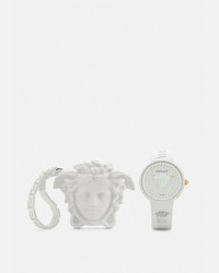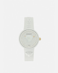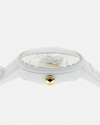 DETAILS A modern timepiece in rich pop colours detailed with tonal Versace symbols including a three-dimensional Medusa, a Greca inner ring and Versace lettering on the silicone band. The accessory comes in a matching silicone pouch. - Case: White silicone case - Dial: White dial with 3D Medusa; Greca on the inner dial; Versace logo at 12h - Bracelet: White silicone strap with 3D Medusa; 3D Versace lettering; Tongue buckle - Movement: RONDA 762.2 Swiss quartz 2-hands movement - Water Resistant: 3 ATM Item: PVE6G001-P0023_RTU_TU_PNUL__ SIZE & FIT - Case size: 1'5" in