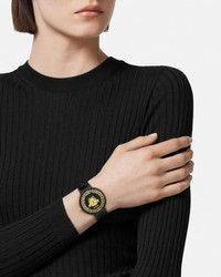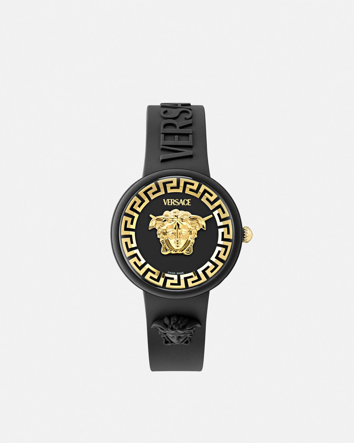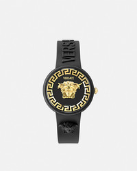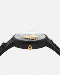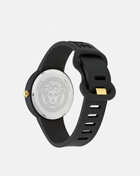 DETAILS Item: - Case: Silicone case with IPYG crown - Dial: Black dial with IPYG 3D Medusa / IPYG Greca on the inner dial / Versace logo at 12h - Bracelet: Black silicone strap with 3D Medusa / 3D Versace lettering / Tongue buckle - Movement: RONDA 762 Swiss Quartz 2-hands movement - Water Resistant: 3 ATM Item: PVE8J006-P0024_RTU_TU_PNUL__ SIZE & FIT - Case: 1.5" / 38 mm