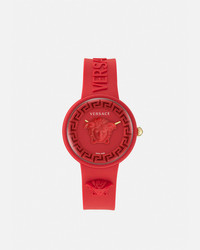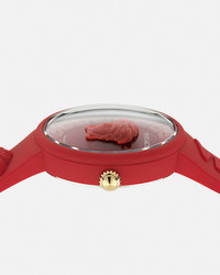 DETAILS A modern timepiece in a pop colour detailed with tonal Versace symbols including a three-dimensional Medusa, a Greca inner ring and Versace lettering on the silicone band. The accessory comes in a matching silicone pouch. All Versace watches are guaranteed by the 'Swiss Made' marking. - Case: Red silicon case - Dial: Red dial with 3D Medusa and Greca on the inner dial / Versace logo at 12h - Bracelet: Red silicon strap with 3D Medusa / 3D Versace lettering and tongue buckle - Movement: RONDA 762.2 Swiss Quartz 2 hands movement - Water Resistant: 3 ATM Item: PVE6G007-P0023_RTU_TU_PNUL__ SIZE & FIT - Case: 1.5"