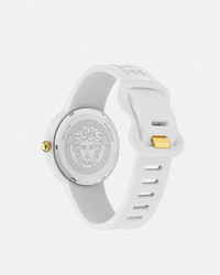 DETAILS Item: - Case: Silicone case with IPYG crown - Dial: White dial with IPYG 3D Medusa / IPYG Greca on the inner dial / Versace logo at 12h - Bracelet: White silicone strap with 3D Medusa / 3D Versace lettering / Tongue buckle - Movement: RONDA 762 Swiss Quartz 2-hands movement - Water Resistant: 3 ATM Item: PVE8J005-P0024_RTU_TU_PNUL__ SIZE & FIT - Case: 1.5" / 38 mm