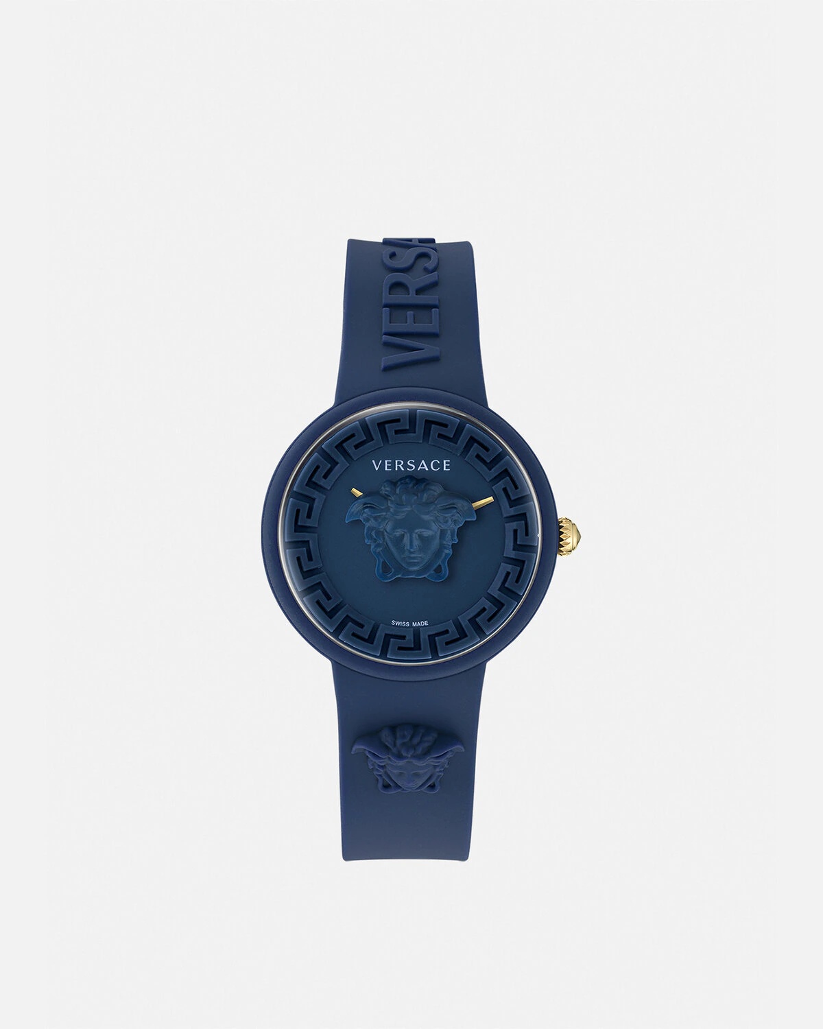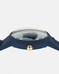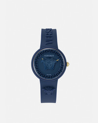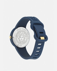 DETAILS A modern timepiece in a deep monochrome colour detailed with tonal Versace symbols including a three-dimensional Medusa, a Greca inner ring and Versace lettering on the silicone band. The accessory comes in a matching silicone pouch. All Versace watches are guaranteed by the 'Swiss Made' marking. - Case: Navy Blue silicon case - Dial: Navy Blue dial with 3D Medusa and Greca on the inner dial / Versace logo at 12h - Bracelet: Navy Blue silicon strap with 3D Medusa / 3D Versace lettering and tongue buckle - Movement: RONDA 762.2 Swiss Quartz 2 hands movement - Water Resistant: 3 ATM Item: PVE6G006-P0023_RTU_TU_PNUL__ SIZE & FIT - Case: 1.5"