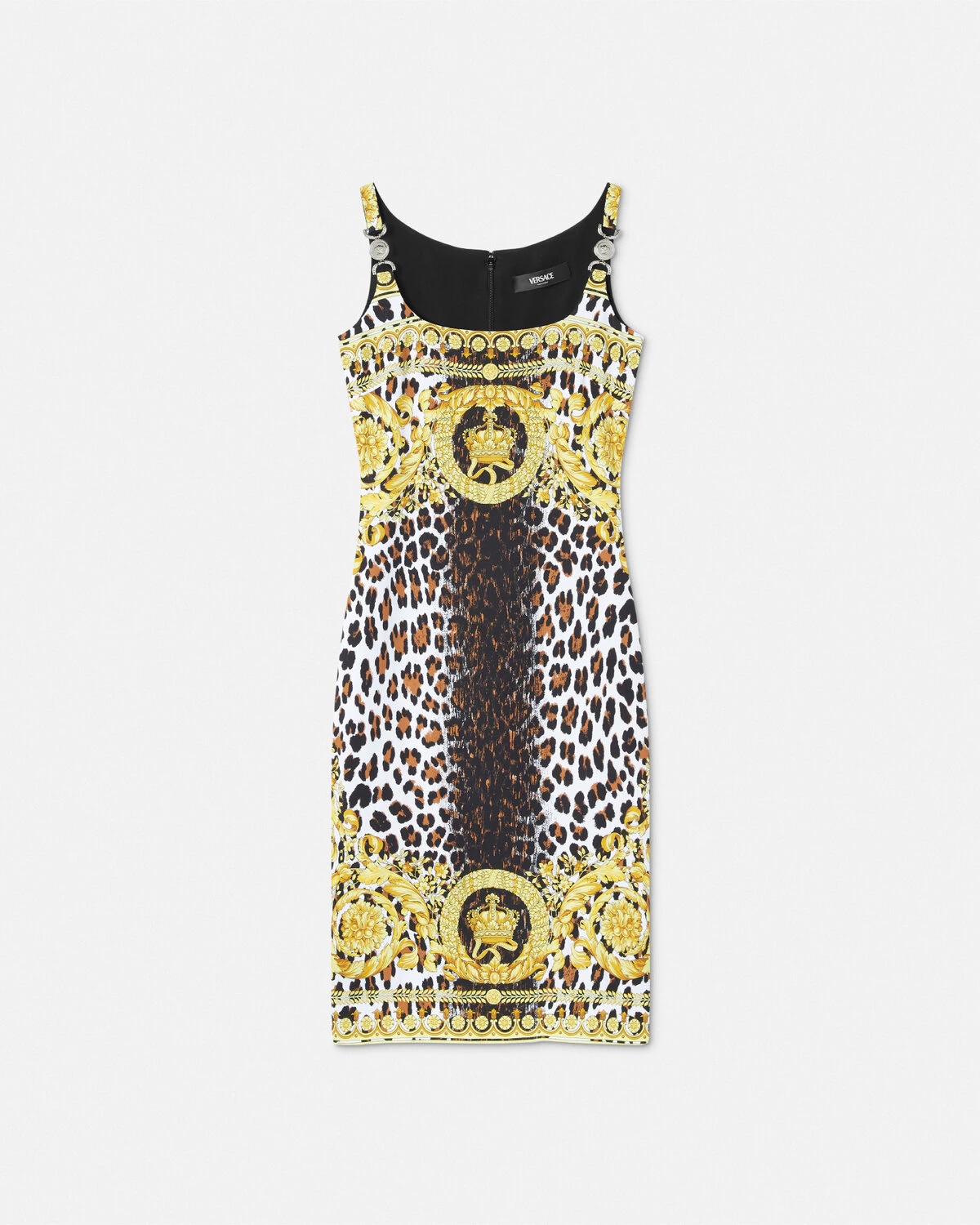 DETAILS A slim fitted midi dress in a leopard print and Barocco motifs featuring an accent Medusa 95 detail on the shoulder straps - Wild Barocco print - Medusa '95 hardware - Sleeveless - Scoop neckline - Concealed back zip closure - Outer composition: 100% Viscose - Lining: 75% Acetate, 25% Silk Item: 1016410-1A12483_5W050
