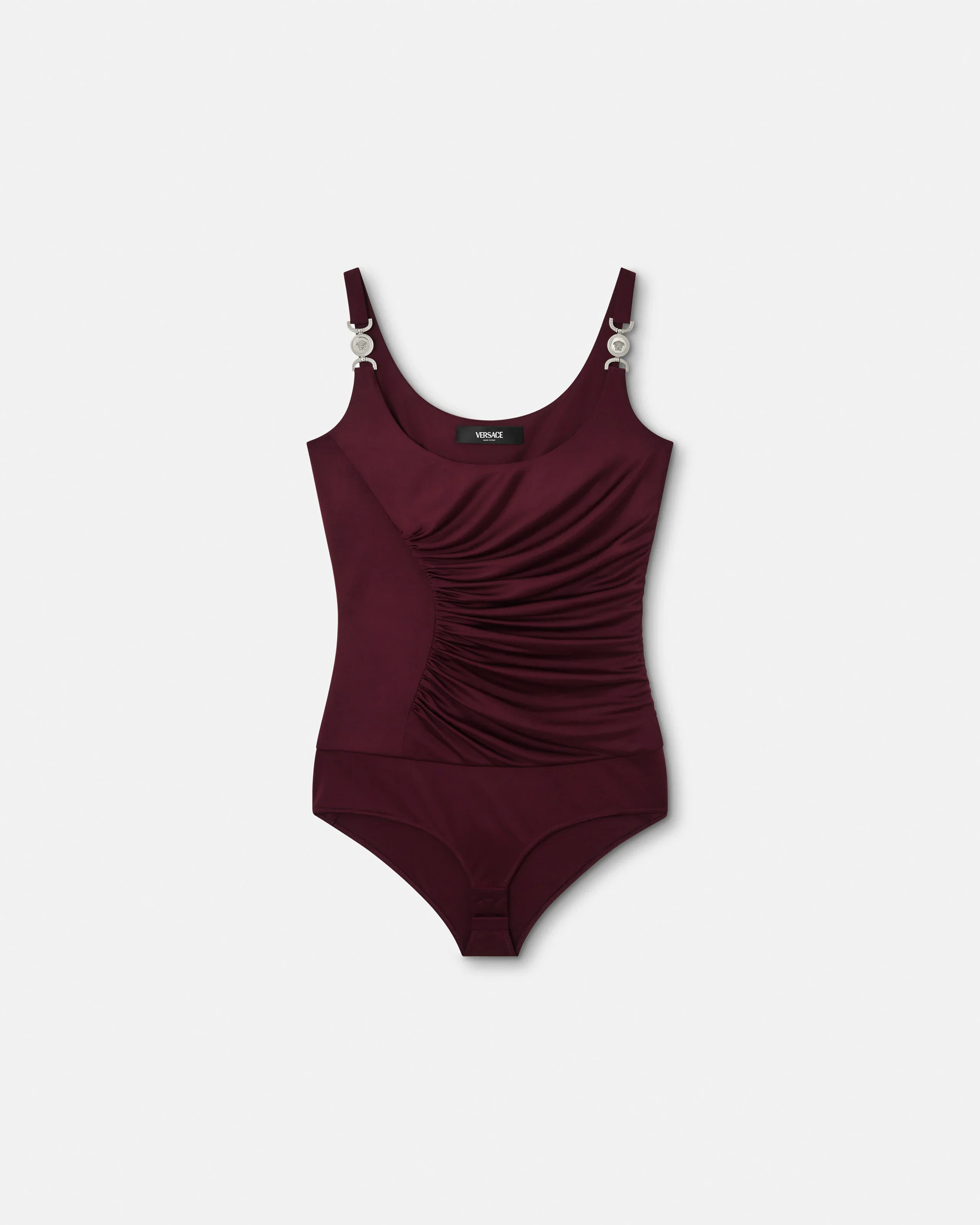 This fitted draped sleeveless bodysuit is crafted from a fluid viscose jersey and features Medusa '95 hardware on shoulder straps. - Medusa '95 hardware - Sleeveless - Shoulder straps - Round neckline - Concealed side zip closure - Hook-and-eye closure - Outer composition: 100% Viscose - Lining: 100% Viscose Size & Fit - The model is 5'9" / 1.76 m tall and wears size 38 IT Item: 1022627-1A12497_1RD90