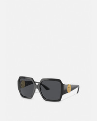 Geometric tortoiseshell sunglasses featuring a Medusa emblem at the side. DETAILS & CARE - Medusa hardware - Frame color: Black - Temple color: Black - Lens color: Dark grey