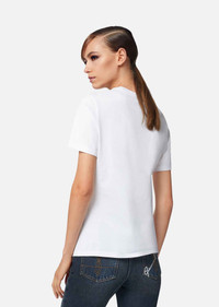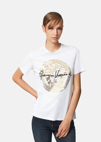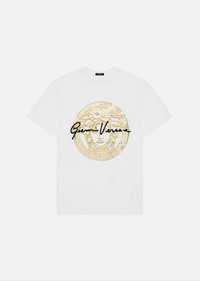 Easily styled from AM to PM, this pure organic cotton t-shirt boasts a printed Medusa fused with Gianni Versace's handwritten signature. Style yours with jeans and a pair of Squalo for a casual daytime look or high heels and a leather jacket for evening edge. DETAILS & CARE - Crew neck - Short sleeves - Medusa - GV Signature - Outer fabric: 100% Cotton - Machine wash cold on reverse (delicate) - Protect accessory before washing - Wash separately - Do not dry clean - Do not bleach - Do not tumble dry - Iron on reverse max. 110 °C. avoiding embroidered parts - Made in Italy SIZE & FIT - Loose fit - All sizes fit Italian standards - The model is 1,80m tall and wears a size 38