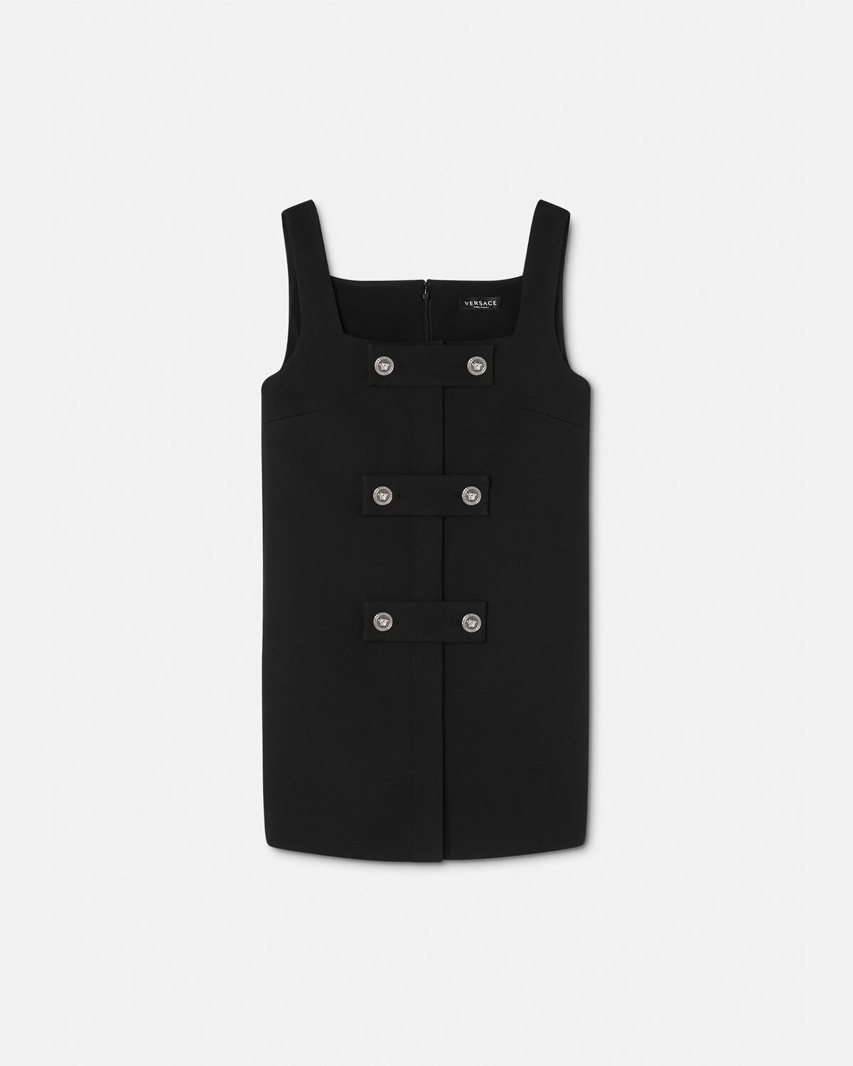 This sleeveless shift mini dress is accented by decorative Medusa buttons and is made in a compact technical Cavalry twill fabric. DETAILS & CARE - Medusa hardware - Sleeveless - Shoulder straps - Concealed back zip closure - Outer composition: 100% Polyester - Lining: 75% Acetate, 25% Silk - Do not wash - Do not bleach - Do not tumble dry - Cool iron - Delicate dry clean - Protect accessory before washing SIZE & FIT - The model is 5'8" tall and wears size 38 - All sizes fit Italian standards