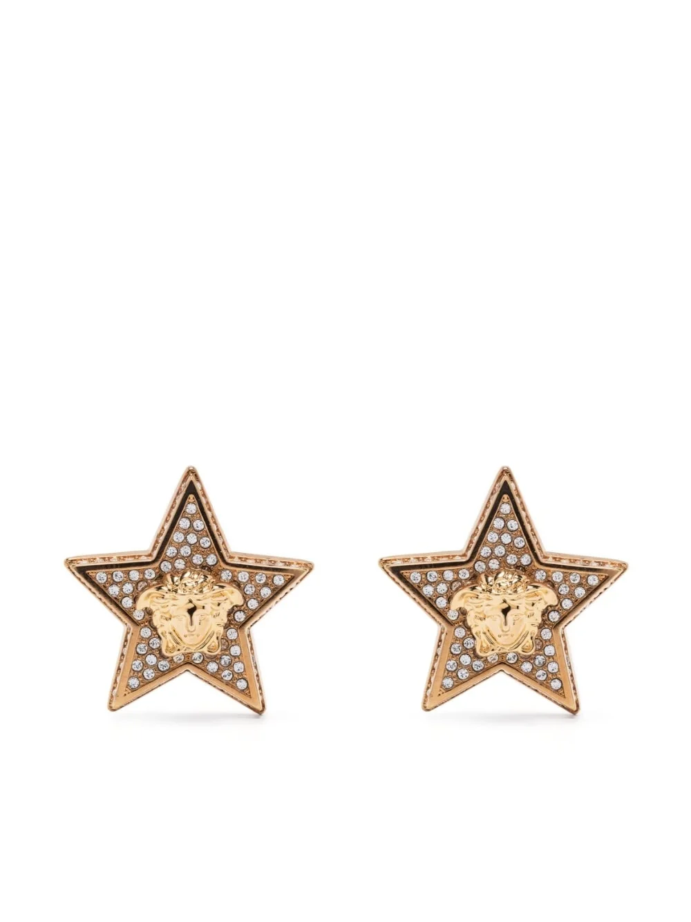 Medusa Star stud earrings Merging impactful detailing with signature emblems, these Versace earrings are punctuated with crystals and elevated by gilded Medusa Heads. They're crafted to the shape of a star, reminiscent of Hollywood's Walk of Fame. Highlights - Gold-tone - Star-shaped - Medusa head motif - Pave setting - Glass crystal embellishment - Push-lock fastening - For pierced ears - These earrings come as a pair. Made in Italy SIZE & FIT Model measurements Height 5 ft 8 in(1.73 m) Bust/Chest 33.07 in(84 cm) Hips 35.03 in(89 cm) Waist 24.8 in(63 cm) Measurement HEIGHT 0.98 in(2.5 cm) Weight (single earring) 11 g(11 g) WIDTH 0.98 in(2.5 cm)
