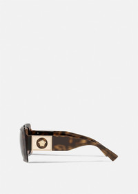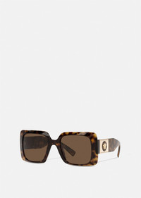 Glamorous and oh-so-Versace, these squared sunglasses are embellished with a bold Medusa accent on the temples. The style features a classic Havana frame and dark brown lenses. DETAILS & CARE - Square shape - Frame color: Havana - Temple color: Havana - Details: Medusa on the temples - Lens color: Dark brown - Full rim - Can be adapted for some prescription lenses - Frame: - Temples: - Made in Italy SIZE & FIT - Bridge: 22 - Temple: 140 - Width: 54 - Height: 47.4