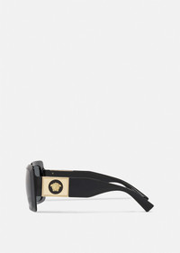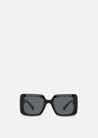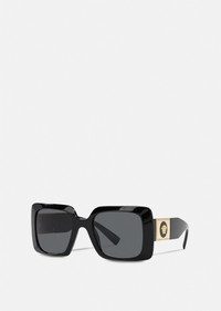 Intrinsically Versace, these squared sunglasses are embellished with a bold Medusa accent on the temples. The style features a glamorous black frame and grey lenses. DETAILS & CARE - Square shape - Frame color: Black - Temple color: Black - Details: Medusa on the temples - Lens color: Dark grey - Full rim - Can be adapted for some prescription lenses - Frame: - Temples: - Made in Italy SIZE & FIT - Bridge: 22 - Temple: 140 - Width: 54 - Height: 47.4