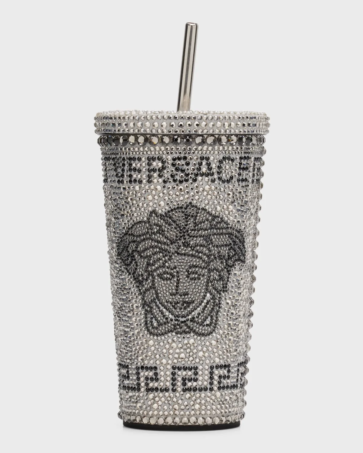 Take your coffee, smoothie or fruit juice to go in style with this travel mug that epitomizes the Versace glamour. Entirely enriched with crystals, the mug features a gold tone Medusa surrounded by Greca borders. Includes: mug, lid, and reusable straw. Holds 16 ounces Made of aluminum. Made in Italy.