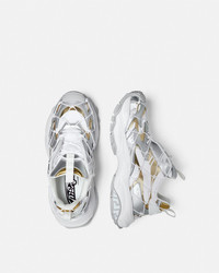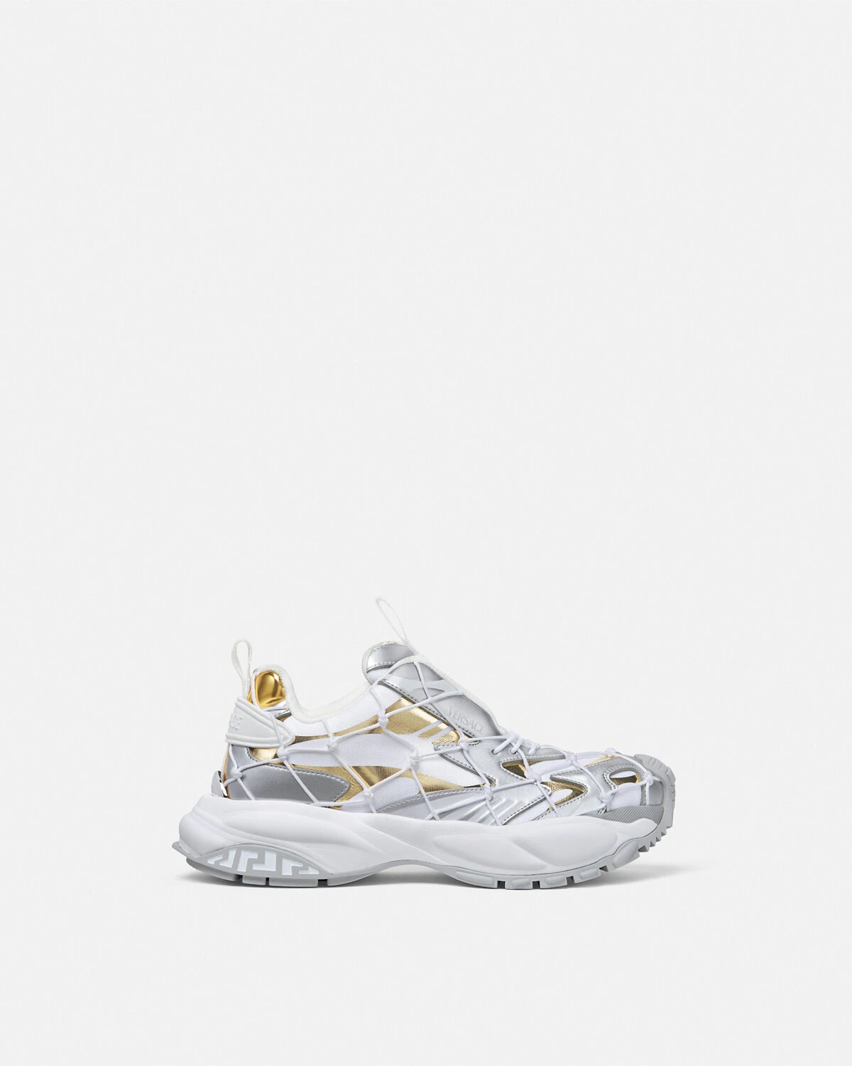 DETAILS A futuristic design fusing the codes of the House with intricate craftsmanship Versace Mercury MVS03 is set on lightweight shockabsorber Greca rubber and EVA soles Breathable mesh uppers feature foil screenprinted inserts and are distinguished by a superimposed handknotted rope net construction The footbed features dynamic screenprinted Mercury lettering and the tongue is detailed by a foil Versace logo and a jacquard Greca ribbon pull tab - Versace logo on tongue - M_VS_03 style code on heel counter - Versace logo engraved on side rubber loop - Greca pull tab - Low top - Lace-up - High rebound performance - Outer composition: 61% Polyester, 38% Nylon, 1% Elastane - Lining: 100% Calf leather - Sole: 100% Rubber Item: 1016380-1A11509_6W690 SIZE & FIT - The shoe weighs approximately 17.6 oz / 0.5 kg for the model size 37 IT - Footbed: comfortable - Fits true to size, take your normal size
